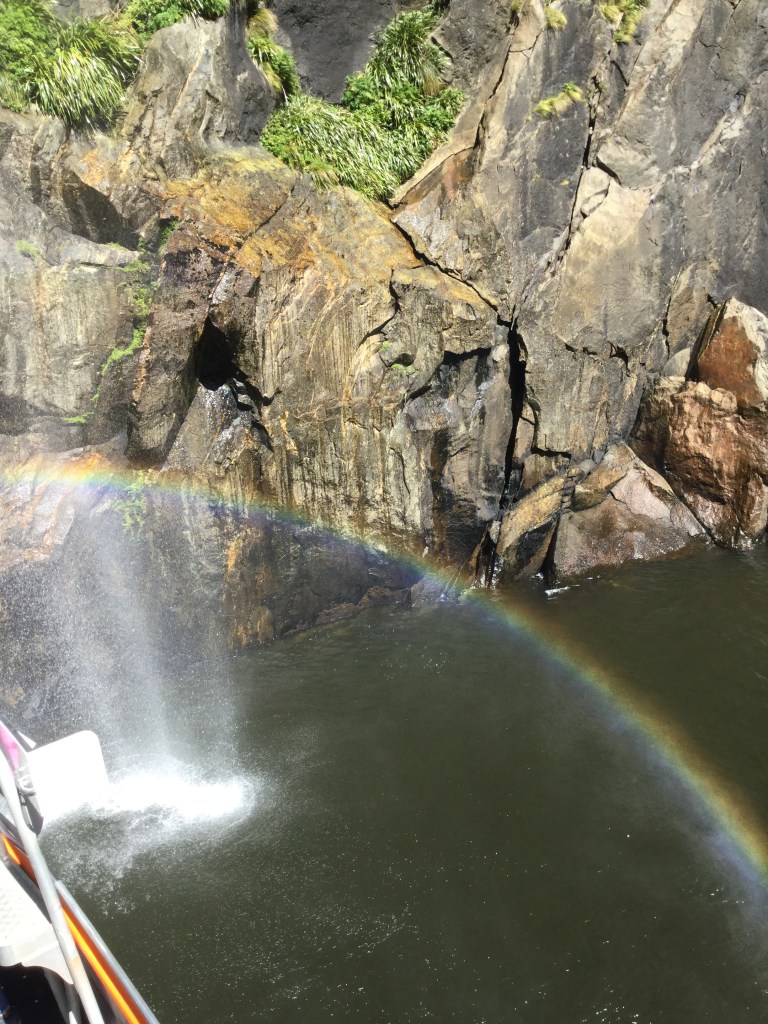 Milford Sound is known informally as the eighth natural wonder of the world, and it’s not hard to see why. Evidently, no photo can capture the scale and texture of such a grand place, and I wasn’t sure what to expect before going. But it is not something to be missed. Towering vertical cliffs adorned with moss, grass, and even trees drip with recent rains; huge mountains rise out of the water like the spines of a giant stegosaurus. Cruising around on the ferry, it’s an amazing experience.