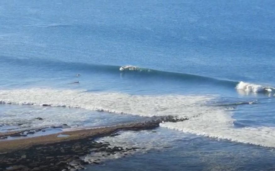 As you can see in the picture above, there are distinct stripes of rock beneath the west end of the beach, producing good waves that break far out on a day with good conditions. (They don’t tend to be sharp or stick out of the water, so it’s safe as long as you’re careful.) This isn’t the only good spot, though, and you see lots of surfers out directly in front of the car park as well.
